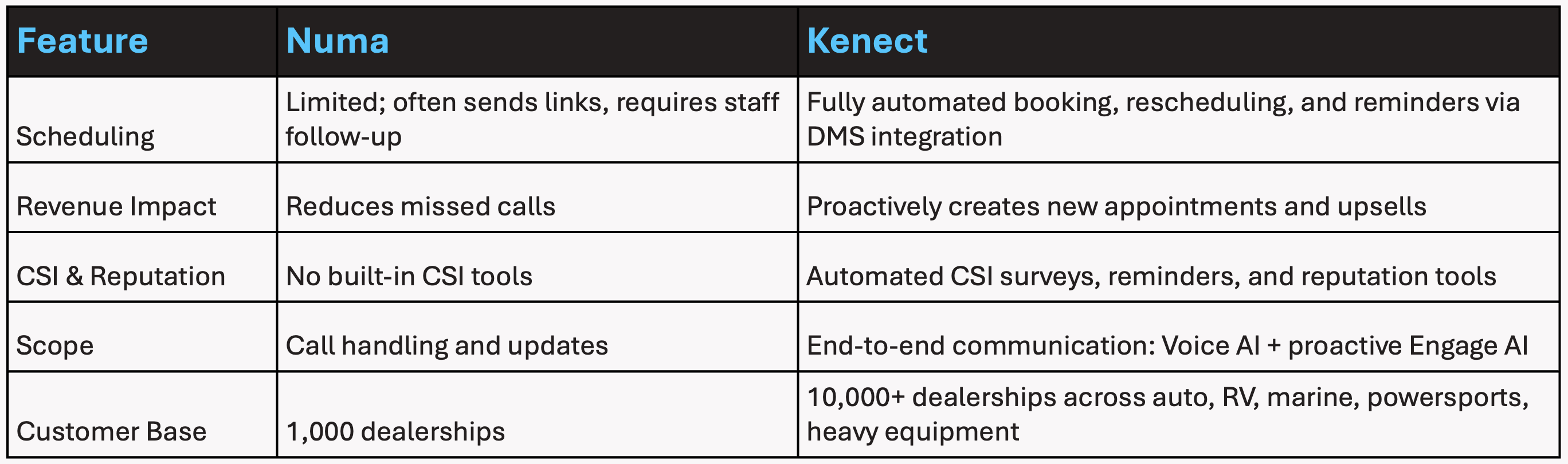 In short: Numa is a strong choice for missed-call coverage and service updates, but Kenect is the platform for growth—helping dealers fully automate engagement, build loyalty, and maximize service revenue.
